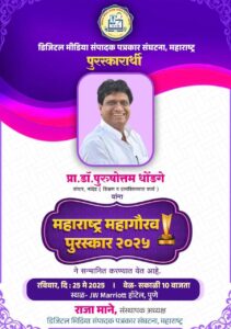 शैक्षणिक व सामाजिक क्षेत्रातील उल्लेखनीय कार्यासाठी श्री शिवाजी मोफत एज्युकेशन सोसायटीचे अध्यक्ष प्रा.डॉ. पुरुषोत्तम धोंडगे यांना डिजिटल मीडिया संपादक पत्रकार संघटना, महाराष्ट्र, मुंबई यांच्या वतीने महाराष्ट्र महागौरव पुरस्कार २०२५ ने सन्मानित करण्यात आले. राज्याचे उच्च व तंत्रशिक्षण मंत्री चंद्रकांतदादा पाटील व ग्रामविकास व पंचायतराज मंत्री जयकुमार गोरे यांच्या हस्ते प्रा.डॉ. पुरुषोत्तम धोंडगे यांना रविवारी, २५ मे रोजी सकाळी १० वाजता जे डब्ल्यू मॅरियेट हॉटेल, पुणे येथे हा पुरस्कार प्रदान करण्यात आला. सन्मानचिन्ह असे पुरस्काराचे स्वरूप आहे.